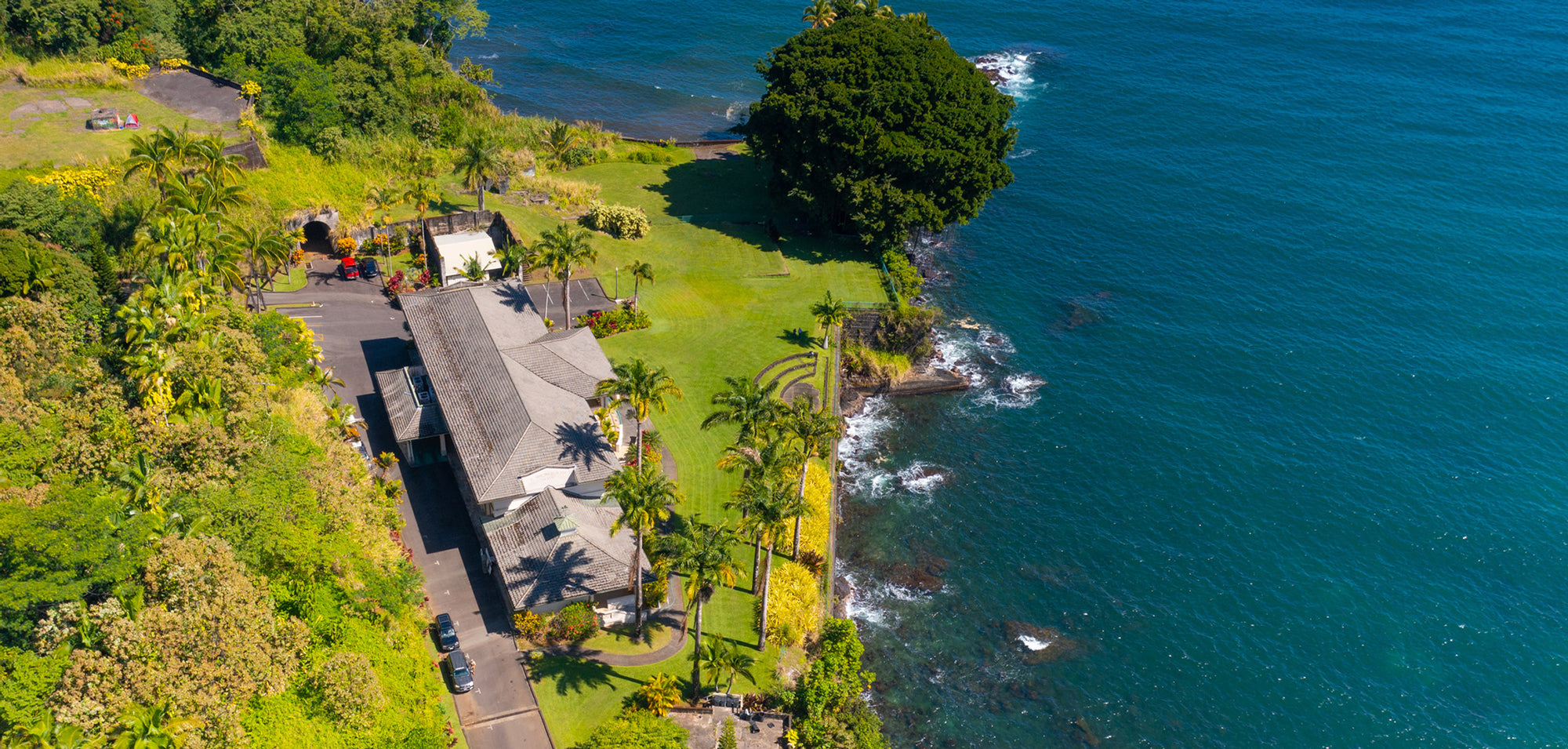 With sweeping panoramic views, the property overlooks Hilo Bay across manicured coastal grounds framed by royal palms, coconut trees, and a variety of colorful kī plants. Ceremonies on the great lawn or in the stone built amphitheater create a one of a kind and unforgettable experience. Outdoor receptions unfold across the lawn beneath open sky or tented cover. Guests can also enjoy smaller indoor spaces, including an intimate second-story speakeasy, that provide adaptable settings for close gatherings, rehearsal or welcome dinners, or private meals.
